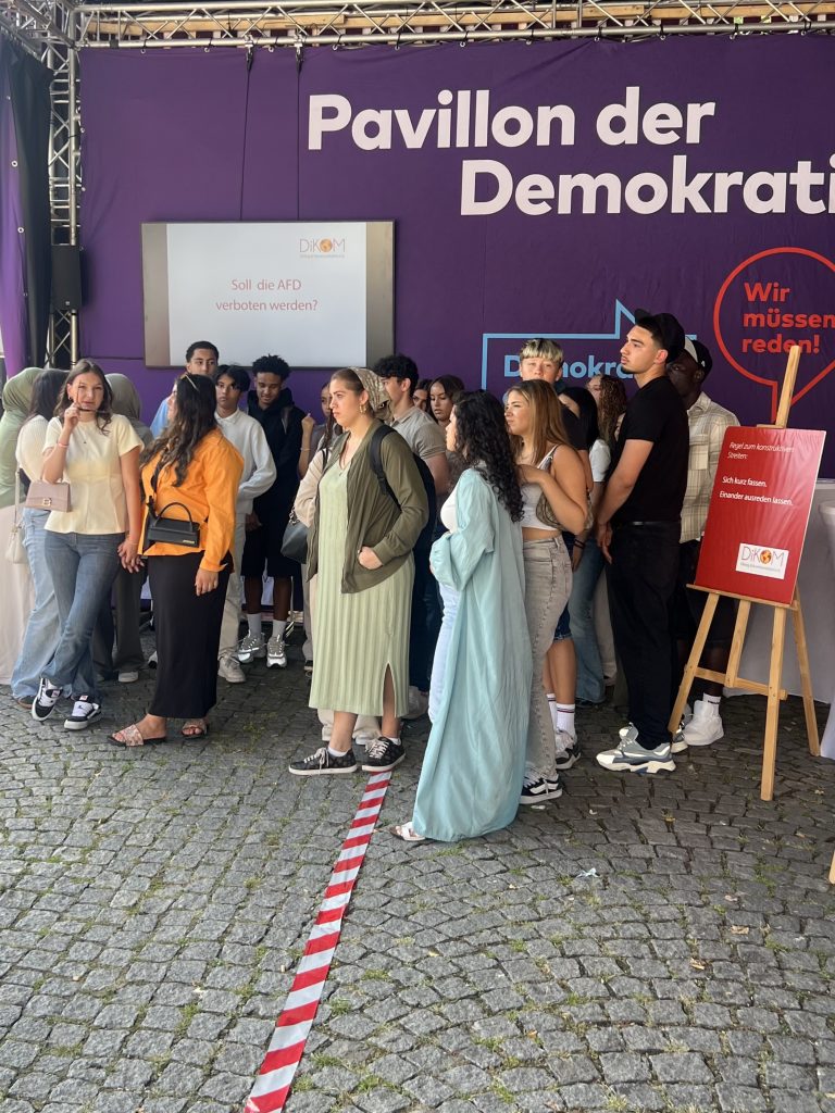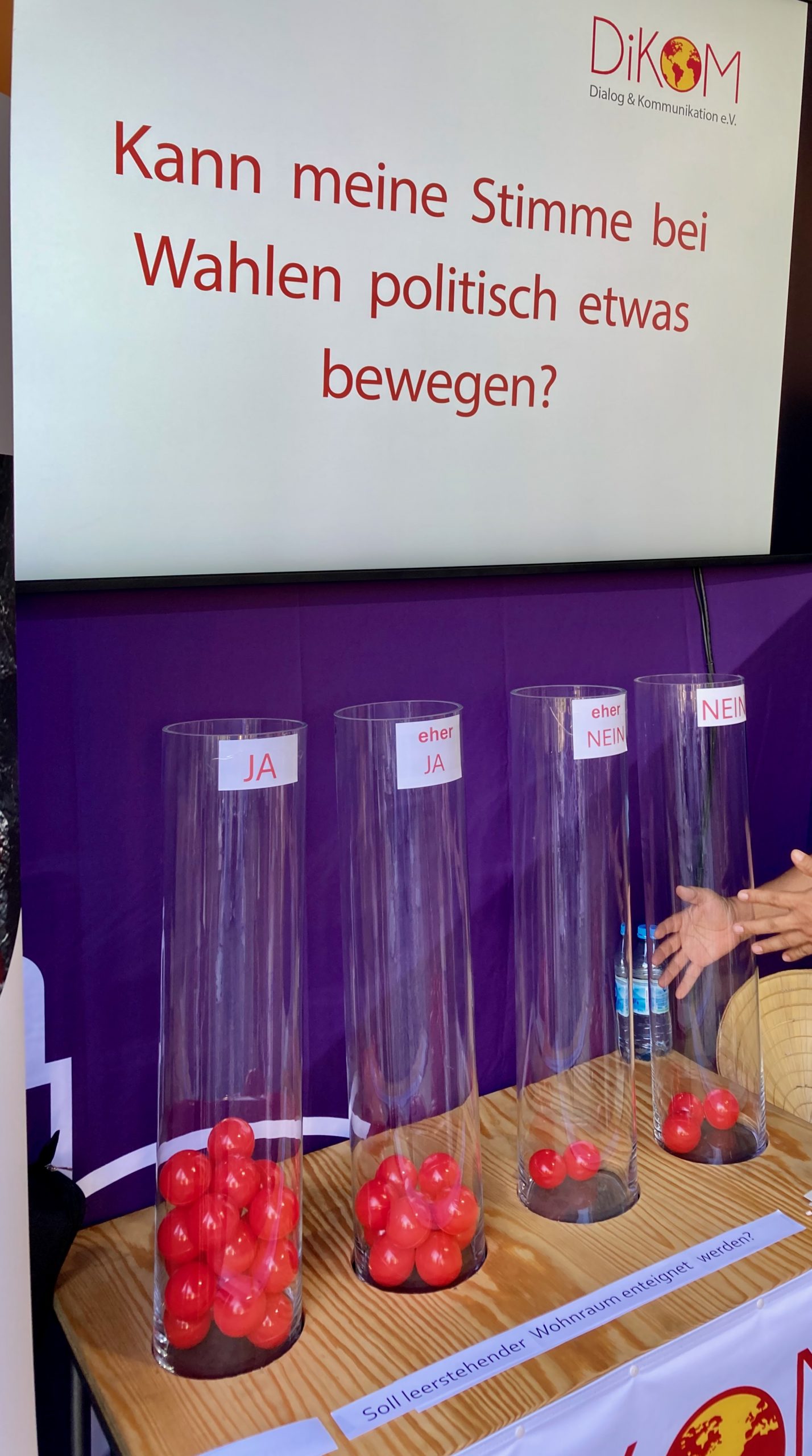2024 wurde die Aktion in den Pavillons im Nordend (in Kooperation mit „Mehr Bock auf Politik – Mehr Mut zum Gestalten“, beramí e.V.) in Bockenheim und in Höchst (in Kooperation mit dem Hessischen Flüchtlingsrat) angeboten. Die Diskussionsrunden wurden von den Besucher*innen gut angenommen und haben allen Beteiligten Spaß am Argumentieren gebracht. DiKOM e.V. wird das Format auch 2025 in den Pavillons der Demokratie anbieten.